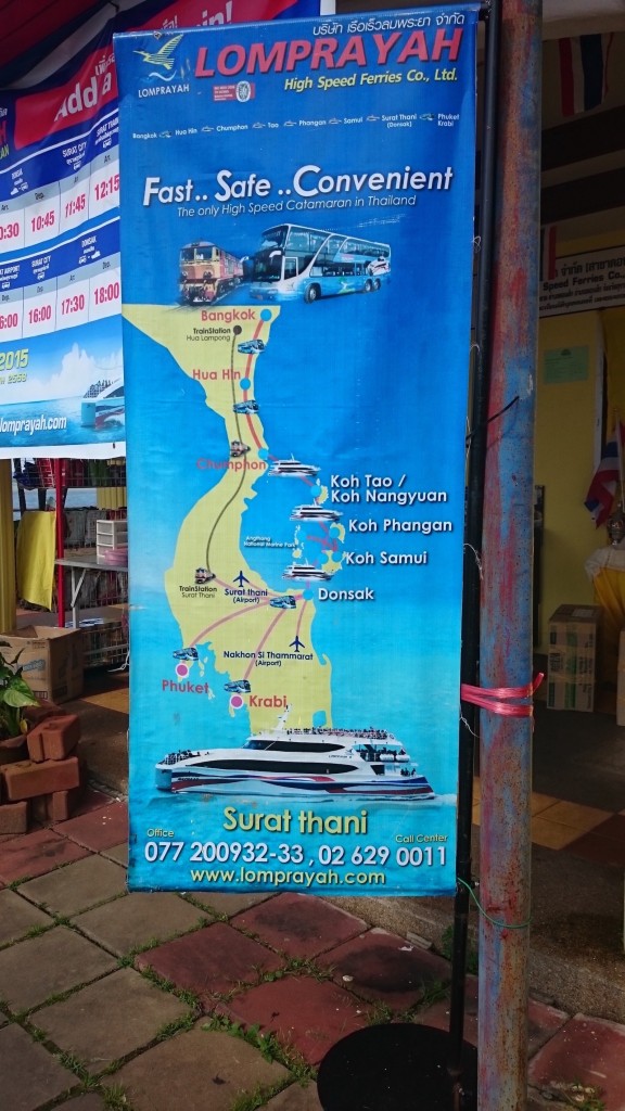Aber wir wollen ja auch nicht zu spät kommen, also zahlen wir das Geld. Der Fahrer ist auch pünktlich am Hotel und los geht es. Im Vorfeld hatte ich angst, dass wir eventuell spät dran sein könnten, wegen des Verkehrs. Aber Glück gehabt! Heute ist ein Feiertag und die Fahrt zum Flughafen verläuft sehr flüssig. Wir sind also gute zwei Stunden vor Abflug dort. Erstmal wird gefrühstückt. An einem Imbiss werden klassische Sandwiches angeboten, also Ham/Cheese, Thunfisch usw. Sie sind preiswert, darum nehmen wir es. Eigentlich wollte ich versuchen keine europäisches Essen zu kaufen, aber das ist gar nicht so einfach. Vor allem, wenn man morgens noch keinen Appetit auf Ente kross hat. Naja..in Deutschland isst man ja auch Sushi. Der Flug nach Surat Thani vergeht reibungslos und sehr schnell. Beim Landen sehe ich schon, dass es hier sehr viel mehr Jungel gibt. Das merkt man auch beim verlassen des Flughafens. Es ist saumäßig schwül. Bereits im Flughafen konnten wir unsere weitere Tour planen. Erst geht es mit dem Bus zum Hafen und von dort mit dem Schiff nach Samui. Die Busfahrt dauert recht lange. Man sieht eine schöne Landschaft, die auch teilweise aus Plantagen, z.B. Reis, besteht. Zwischenzeitlich fahren wir durch einen Regenschauer, der etwa 5 Minuten anhält.