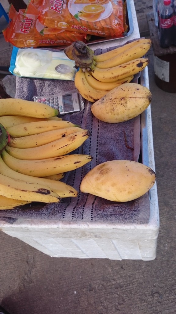 Endlich am Hafen angekommen knallt die Sonne uns sofort auf den Pelz. Es ist jetzt 14.30 und wir müssen bis 16 Uhr warten bis wir abfahren können. Kein Problem, wir haben eh Hunger. Wir haben die Wahl zwischen einem Bistro oder einem der bekannten Stände am Straßenrand, wo Einheimische Essen verkaufen. Wir entscheiden uns natürlich für den Stand. Wir kaufen rote Bällchen, die nach Fisch schmecken (sie haben Fit gesagt ich dachte erst, dass wäre eine spezielle Fischart, aber sie meinten wohl einfach „Fisch“) und eine Wurst am Spieß. Außerdem sehen wir Bananen und eine uns unbekannte Frucht dort rumliegen. Ich kaufe die unbekannte Frucht und frage die Frau, ob sie uns die Frucht klein schneiden kann. Da bemerke ich, dass es sich wahrscheinlich um eine Mango handelt.