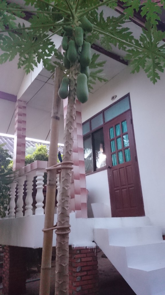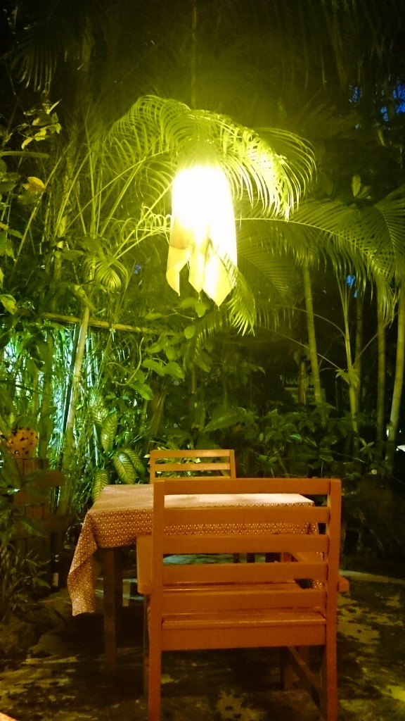Unser Bungalow befindet sich fast direkt am Strand, aber hat keine Klimaanlage, sondern nur einen Ventilator. Wir wollen versuchen uns an das Klima zu gewöhnen. Schnell merken wir, dass es vielleicht ein Fehler war. Jetzt packen wir schnell das nötigste aus und suchen uns etwas zu essen. Wir finden sofort ein hübsches Restaurant mit bunten Lampions und rundrum begrünt. Beim Blick auf die Karte wird klar: das Essen hier ist viel besser als alles davor. Es stimmt also doch: die Thaiküche ist super. Der Kellner stellt uns sofort ein Moskitospray und ein Räucherstäbchen hin. Wir haben zwar vorher schon Mückenspray benutzt, aber ich wurde sofort gestochen.