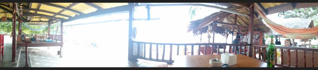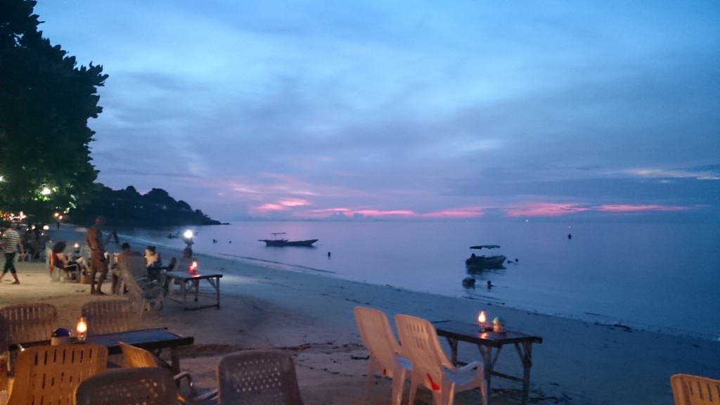 Das einchecken geht sehr schnell, es wird kurz ausgepackt und sofort wird ausgetestet ob die Frau recht hatte, als sie meinte, dass wir zum Strand einen Fußweg von 1 Minuten haben. Sie hatte recht :). Der Strand ist schön, schöner als alles auf Koh Samui, den kanarischen Inseln zusammen. Der Sand ist von der Korngröße und der Farbe nur knapp entfernt von Mehl. Uns bietet sich ein toller Blick auf grüne Hügel aus denen manchmal eine Kalksteinformation herausschaut. Das Wasser ist knallblau und glasklar zugleich. Direkt am Strand gibt es mehrere Bars bei denen man die Möglichkeit hat am Tisch zu sitzen, in einer Loungeartigen Ecke am Tisch zu liegen oder einfach am Strand auf einer Decke zu sitzen. So sieht es hier überall aus! Wir merken sehr schnell, dass der Relaxfaktor Koh Phangan um einiges höher liegt als der Rest, den wir bisher kannten (es tut mir fast ein bisschen Leid die Insel Koh Samui so in den Dreck zu ziehen, aber es ist einfach schick hier).