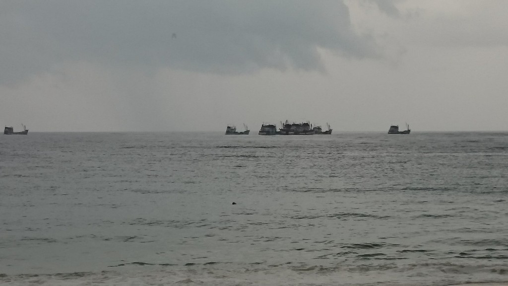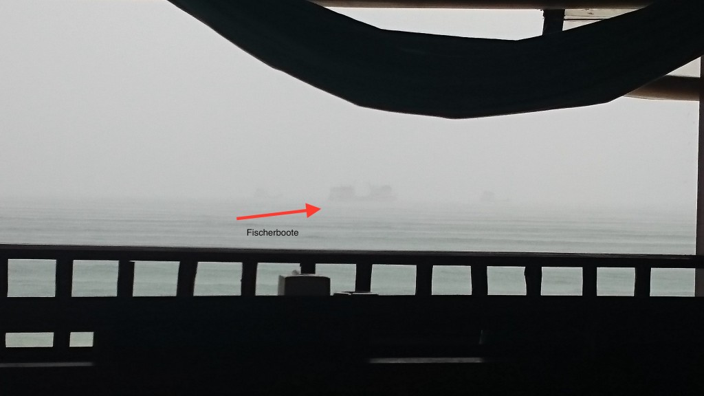 In der Nacht bin ich wach geworden. Zuerst höre ich ein Konzert von bellenden Hunden, zirpenden Grillen, quäkenden Geckos und einem Gecko, der tatsächlich seinen Namen ruft. Die kleinen Geckos geben eher so Tok Tok Tok Geräusche von sich. Ursprünglich dachte ich, das wäre ein Vogel, bis ichs live erlebt habe. Vor ein paar Tagen habe ich bereits einen sehr großen Gecko an einem Bungalow sitzen sehen. Die meisten sind hier nur ca. 10cm groß, der Hauswandgecko misst bestimmt 20-30cm. Ich vermute, dass es einer von der Größe ist, der dieses Geck-ooo Geräuch schon sich gibt. Während man das liest, muss man sich die Stimme von jemanden vorstellen, der Kehlkopfkrebs hat und nur noch durch so ein Rohr reden kann. So ähnlich klingt das. Bei dem Gecko ist das jedenfalls niedlich. Irgendwann wird es recht schlagartig ruhig, ich kann sogar das Meer rauschen hören. Das hab ich bisher noch nie, das kommt mir etwas verdächtig vor. Und dann fängt es an zu regnen. Es muss ein enormer Schauer sein, es hört sich an wie eine Sintflut. Ok, denke ich mir, lieber jetzt als morgen tagsüber. Zwischendurch fällt mir noch ein, dass unsere Schuhe draußen stehen. Die dürften morgen aufgeweicht sein. Als ich dann früh aufwache ist der Himmel immer noch grau, aber der Regen scheint weg zu sein. Beim ersten frische-Luft-holen auf der Veranda merke ich dann schnell, dass es doch noch regnet, es ist eher ein nieseln. Die Schuhe habens aber überlebt. Weils ja nicht mehr so doll regnet, machen wir uns auf den Weg zu dem Cafe, bei dem wir gestern schon gefrühstückt haben. Wir gehen am Strand lang und das Nieseln entspricht etwa dem, was wir in Deutschland als konsequenten Landregen bezeichnen würden. Heute sehen wir ein paar Fischerboote (die Tintenfische fangen) sehr nah an der Küste. Normalerweise erahnt man sie nur von weitem.