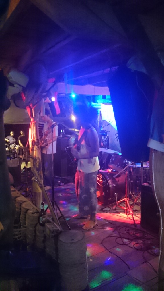 Wir haben auf der Insel eigentlich nur die Wahl zwischen Techno und dieser Reggaeparty. Dann lieber die Rastafreunde. Das Konzert beginnt erst um 10 darum sitzen wir eine Weile rum, essen was und nutzen das Wlan aus. Irgendwann ist es richtig voll und man sieht dem Großteil des Publikums irgendwie an, dass diese Party für sie nur ein Zeitvertreib ist, bis sie nächste Woche zur Full Moon Party können. Viele zeigen kaum Interesse an der Musik. Nach einer knappen Stunde wird es aber auch etwas uninteressant für uns. Die Musik ist etwas uninspiriert und eigentlich singt der Sänger größtenteils nur seinen Refrain. Der Sänger selber scheint ein Südamerikaner zu sein, andere Mitglieder der Band eher Asiaten. Es wechselt auch öfter mal die Besetzung, irgendwann kommt ein Bongospieler dazu und ein zweiter Sänger, der ebenfalls amerikanisch aussieht.
