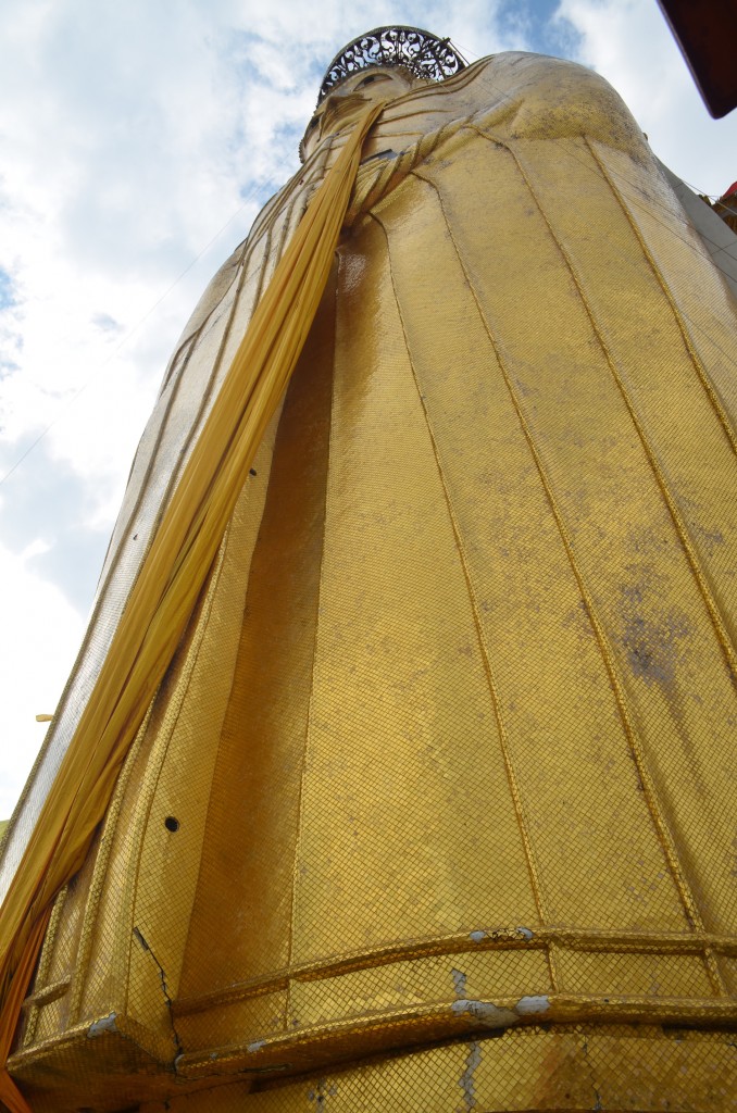 Wir kommen direkt an einer zentralen Straße an, die umgeben ist von Tempeln und Portraits auf denen der König abgebildet ist. Sofort spricht uns jemand an und bietet uns eine Tour mit dem Tuk Tuk. Wir gehen weg und laufen ein Stück auf eigene Faust. Irgendwann quatscht uns wieder jemand an. Eine Frau, die Sprachlehrerin ist. Sie unterhält sich mit uns und schiebt uns geschickt wieder ein Angebot mit den Tuk Tuks unter. Für 40 Baht bringt sie uns zum Big Buddha (nicht zu verwechseln mit dem Big Buddha auf Koh Samui) und zum Lucky Buddha. Sie fragt uns noch, wo wir gerne shoppen gehen und will, dass wir nochmal zu einem „Shopping Center“ gehen. Wir sagen erstmal zu und werden zum Big Buddha gebracht. Er ist über 30 Meter hoch und damit die größte, derzeit existierende Buddhastatue. Bis vor ein paar Jahren gab es eine noch größere Statue in Afghanistan, sie war über 50 Meter hoch und wurde zerstört. Der Bau der Statue hat über 100 Jahre gedauert. Wenn man etwas Glück haben will, so soll man dem Buddha eine Blume, ein gekochtes Ei und einen Makrelenkopf zu seinen Füßen legen. Hier kann man nur Blumen kaufen.