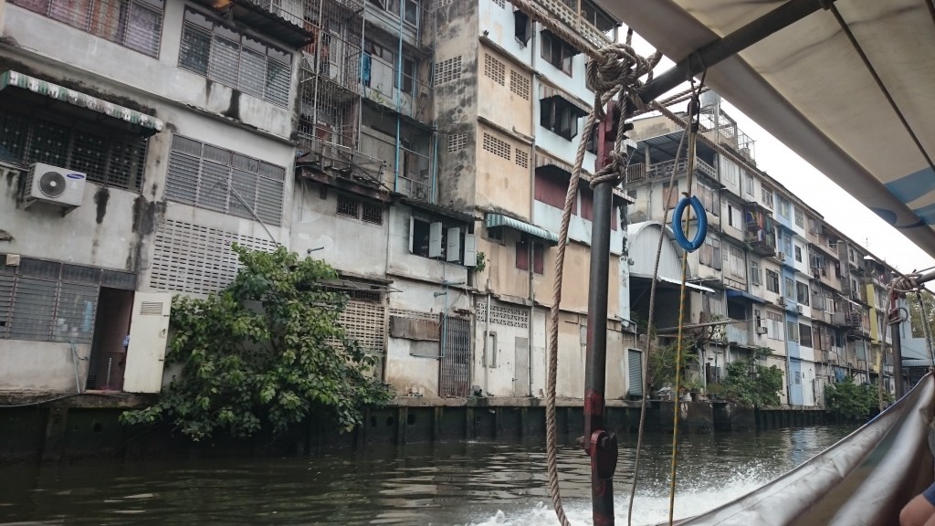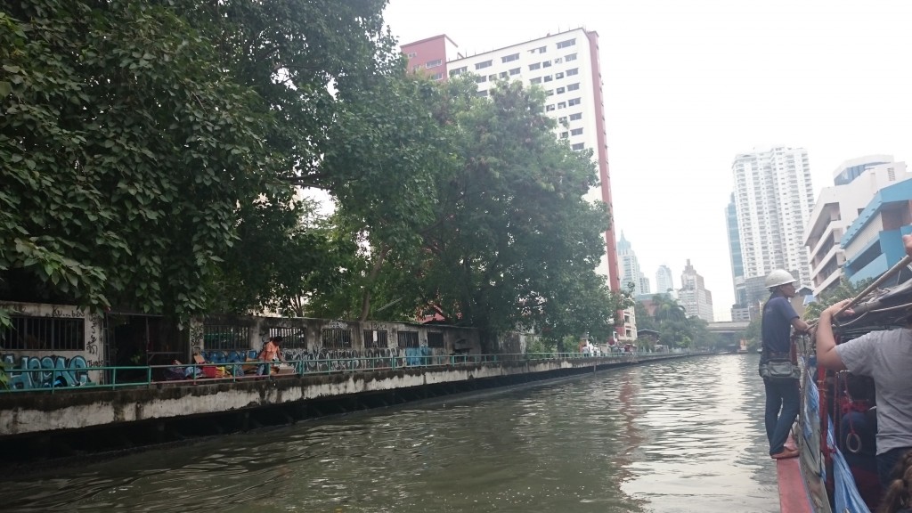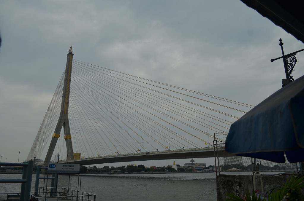 Irgendwann entdecke ich durch Zufall etwas, das wie ein Bahnhof aussieht. Vielleicht eine Skytrain Station? Wir trauen uns die Straße zu überqueren und dorthin zu laufen. Und schwupp, sind wieder 15 Minuten rum. An der Station befindet sich auch eine Bootsstation. Es gibt hier auch große Langboote, die einen von A nach B bringen. Ich habe schon vorher davon gehört, dass es sich dabei um eine gute Alternative zu allem anderen hier in Bangkok handelt. Wir stehen an dem kleinen Hafen und fragen uns wo wir hinmüssen und wo wie Tickets herbekommen. Wir fragen jemanden, er kann nur wenig Englisch. Langsam geben wir auf und überlegen ein Taxi zu rufen. An uns läuft ein europäisch aussehender Mann vorbei und wir fragen ihn. Er kann uns sehr gut helfen, fast scheint er sich ein bisschen besser auszukennen als mancher Einwohner hier. Wir müssen einmal Umsteigen und bezahlen jedes mal 13 Baht pro Person. Damit kommen wir ziemlich weit voran und es geht auch ziemlich schnell.