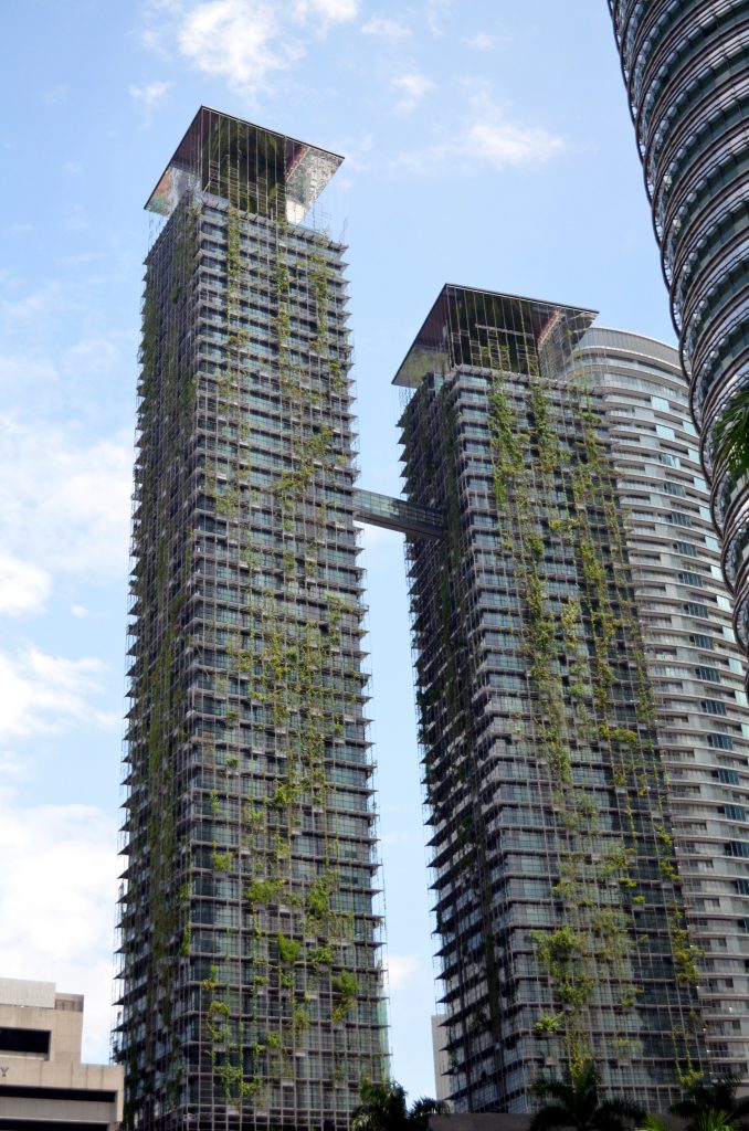 Nachdem wir die Petronas von Weitem gesehen haben wollen wir auch direkt davor stehen. Auch das ist fußläufig zu erreichen. Es ist so angenehm, dass man hier alles einfach zu Fuß erreicht. Um die Petronas Towers herum befinden sich noch einige andere Wolkenkratzer, es ist ein edles Viertel. Sehr schick fand ich das Haus, das von außen begrünt war.