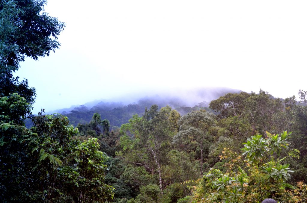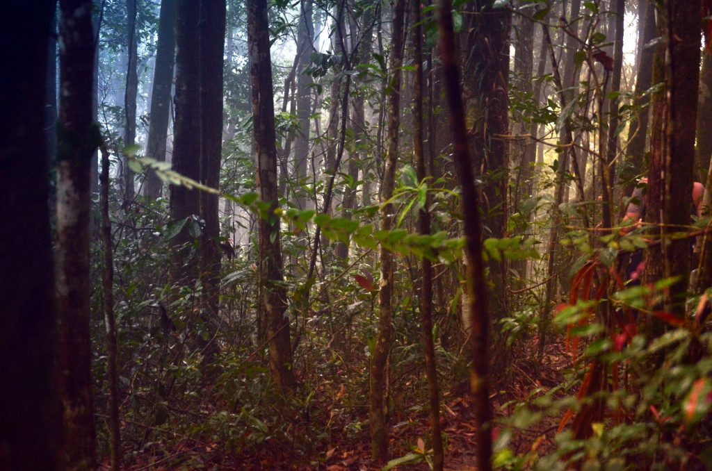 Man lernt während dieser Zeit den Dschungel gut kennen. Es gibt hier viele verschiedene Pflanzen. Mir kommt es so vor, als wenn es verschiedene Stockwerke gibt (weniger im Sinne des üblichen „Stockwerkbaus“ bei Regenwäldern, einfach ein Höhenunterschied). Zwischenzeitlich ist es dicht mit Farnen bewachsen, etwas höher schlingen sich lauter Lianen um jeden Baum, manche von ihnen sind mit Flechten bewachsen und sehen aus als hätten sie Camouflage Kleidung an. Es ist furchtbar schwül, ab und an nebelig und ich kann nicht sagen ob ich schwitze oder nass bin von der Luft und den Regentropfen. Irgendein Tier gibt ein extrem schrilles Geräusch von sich, es klingt wie Trillerpfeifen. Was auch immer das ist, es ist eine Erleichterung als das Geräusch leiser wird. Nach ca. 90 Minuten erreichen wir komplett verschwitzt den Gipfel. Und die Aussicht ist…Atemberaubend. Man sieht nix, wirklich nix, wir befinden uns mitten in einer Wolke. Es sieht demzufolge nicht so aus als wenn sich das demnächst ändert.
