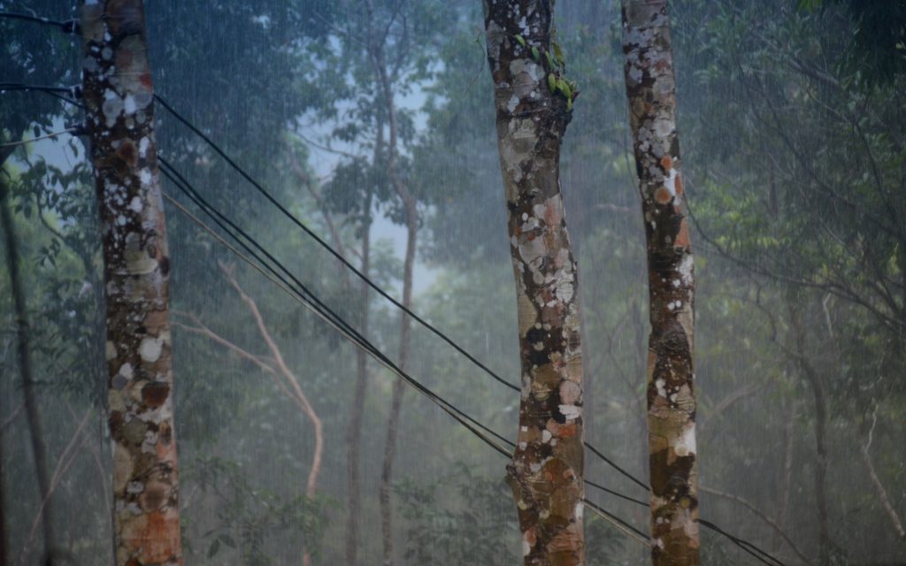 Wir machen einen kurzen halt und gehen wieder nach unten. Zwei mal kommen uns zwei Gruppen entgegen, die auf dem Weg nach oben sind. Bin ich froh, dass ich das hinter mir habe. Der Abstieg geht dann natürlich schneller. Fast unten angekommen kommt der Starkregen. Ein Glück sind ein paar verlassene Hütten in der Nähe, wo wir uns unterstellen können. Nach einer Weile wird es wieder um eine Graunuance heller und wir laufen im sanften Regen weiter.