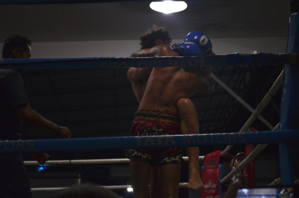 Zunächst wird die Nationalhymne von Thailand gespielt, für die wir alle aufstehen müssen. Anschließend wird von einer Person ein traditioneller Tanz aufgeführt, der ein wenig aussieht wie eine kleiner Vorgeschmack auf das Boxen. Nun gibt es noch eine Feuershow und dann folgt der erste Kampf. Es wird ingesamt 4 Kämpfe geben, wovon einer von einem Deutschen gegen einen Thailänder ausgetragen wird, der sogenannte „International Fight“. Während eines Kampfes wird immer eine traditionelle Musik gespielt, in den Pausen Discomusik. Was die aktuelle Musik angeht dürfte ich inzwischen auf dem neuesten Stand sein ohne es je gewollt zu haben.