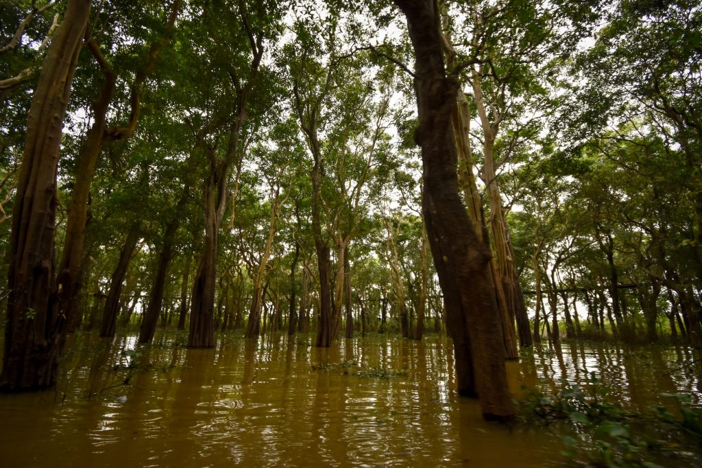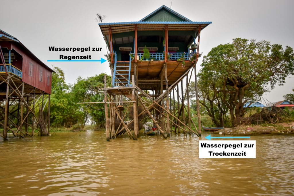 Das waren jedenfalls wieder sehr aufregende Minuten für einen Mitteleuropäer, aber auch Mr.James ist etwas skeptisch. Kurze Zeit später erreichen wir das „Floating Village“, also das schwimmende Dorf. Die Häuser dort sind in 8 Meter Höhe gebaut, das ist auch nötig, denn zur Regenzeit kann das Wasser dort durchaus so hoch stehen. Das bedeutet dann, dass die Kinder mit dem Boot zur Schule kommen. Die Arbeit der Erwachsenen findet vermutlich eh auf dem Wasser statt (ein bisschen frage ich mich, wofür die Kinder dann eigentlich zu Schule gehen). Die Männer sind oft Fischer oder Bauen irgendwas. Frauen arbeiten oft irgendwas mit Touristen.