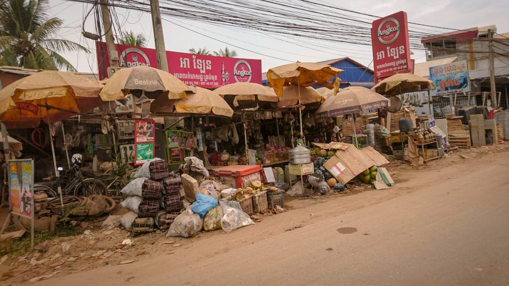 Pünktlich um 14:45 werden wir von Mr.James und dem TukTuk abgeholt. Unser Weg führt direkt raus aus dem Tourigebiet. Wir fahren auf ruckeligen Straßen an den einheimischen Vorbei. Irgendwann landen wir auf der Straße, die Siem Reap mit der Hauptstadt Phnom Penh verbindet. Es wären jetzt etwa 350Km bis Phnom Penh. Die Straße wird von allen Verkehrsmitteln befahren, die es so gibt. Vom kleinen Motorroller bis zum vollkommen überladenen LKW ist hier alles dabei. Stören die kleineren Fahrzeuge einmal, so können sie am Rand auf eine Art Fahrradweg ausweichen. Irgendwann biegen wir ab in einer kleinere Straße, die ziemlich sandig ist. Hier fahren wir durch ein Dorf mit recht primitiven Häusern, manchmal nur Hütten. Aber fast alle Häuser sind auf Stelzen gebaut.
