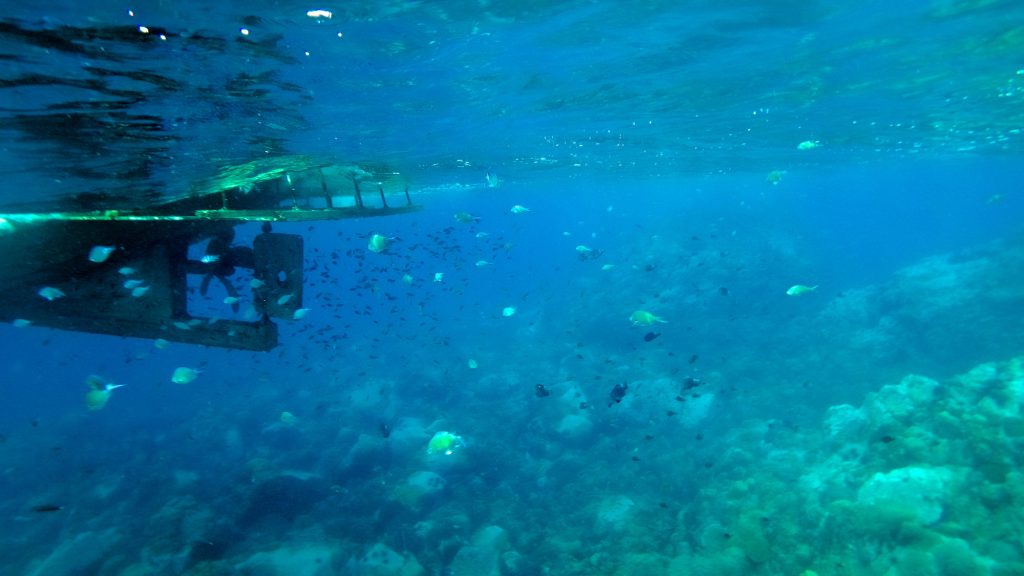 Heute wird es blau. Wir haben eine Bootstour unternommen bei denen 3x geschnorchelt und 2x getaucht wurde (also entweder oder). Sehr praktisch für uns war, dass diese Touren grundsätzlich immer von unserem Pier aus unternommen werden. Wir konnten also in Ruhe frühstücken. Um 8:50 werden wir abgeholt und gehen erstmal in die Tauchzentrale. Dort bekommen die Taucher ihre Ausrüstung, man wird hier sehr gut beraten, meist gibt es einen erfahrenen Tauchbegleiter, der dann 2,3 Taucher betreut. Ich sitze währenddessen da und hoffe, dass die Müdigkeit bald verschwindet (tat sie). Mit dem Boot fahren wir 1.5h bis zum ersten Stop. Endlich am ersten Riff angekommen springen die Taucher zuerst ins Wasser, erst danach dürfen die Schnorcheler. Die Thais wollten mir anfangs unbedingt ne Schwimmweste andrehen, man merkt, dass die keinen Schwimmunterricht in der Schule haben.