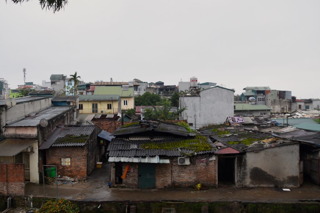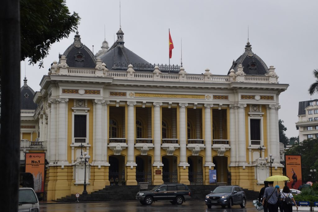 Anschließen begeben wir uns bei leichtem Regen zum Hoh Chi Minh Mausoleum, das wir von außen besichtigen. Um im Innern den Leichnam von Hoh Chi Minh zu besichtigen hätten wir viel früher Tickets kaufen und uns lange anstellen müssen. Direkt in der Nähe befindet sich eine sehr enge Straße durch die mehrmals täglich ein Zug fährt. Wir laufen durch die Straße, über die Schienen, aber der Zug kommt erst einige Stunden später. Die Gegend ist generell etwas pompöser Gestaltet, nur hier haben wir öfter den Hammer und die Sichel gesehen, die auf den Sozialismus hinweisen. Ansonsten gibt es hier von Coka Cola bis zu Mc Donald’s oder Gucciläden alles was das westliche Herz begehert.