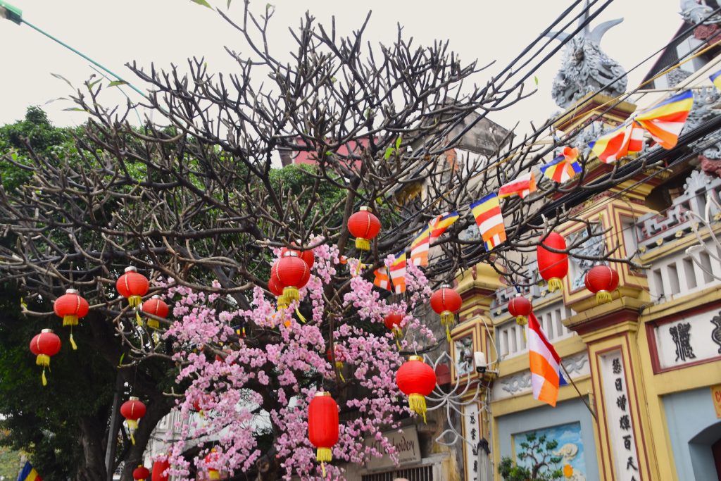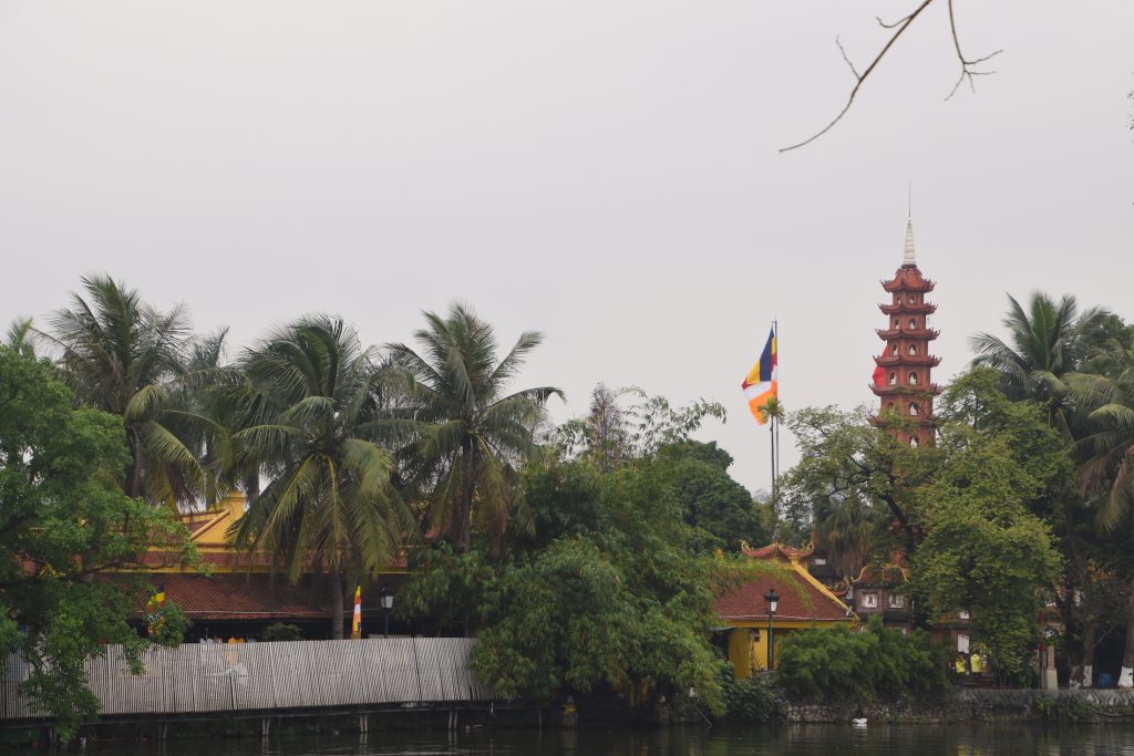 Am nächsten Tag wachen wir wieder halbwegs Energiegeladen auf. Der Wecker hat dennoch um 8.30 geklingelt, denn nach dem Frühstück sind wir mit einer Vietnamesin verabredet, die uns die Stadt zeigen will. Über Facebook habe ich sie kennen gelernt, sie spricht gut deutsch. Das Wetter ist durchwachsen, die Temperaturen liegen über 20 grad was recht hoch ist für diese Jahreszeit. Ab und zu regnet es, aber es handelt sich nur um kurze Schauer. Die Stadt ist noch geprägt vom Chinesischen Neujahrsfest, das erst ein paar Tage her ist. Wir befinden uns im Jahr des Schweins. Typisch ist die Dekoration mit Kirschblütenbäumen. Zunächst bringt sie uns zum nahegelegenen Hoan Kiem See. Wir laufen durch die Altstadt und sie erzählt ein bisschen. Am See selber befindet sich in der Mitte eine kleine Pagode (= ein Tempelgebäude) und eine berühmte rote Brücke über die man gehen kann, wenn man möchte. Mir reicht es ein paar Fotos zu schießen. Da wir eine kleine Müdigkeitsphase haben gehen wir in ein kleines Cafe in einer Seitenstraße. Dort gibt es Kokoskaffee. Also einen Kaffee mit Kokosfleisch drin, wahlweise auch mit Kakao oder Schokolade. Schmeckt ebenfalls sehr gut.