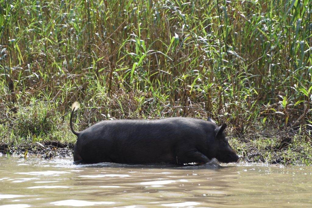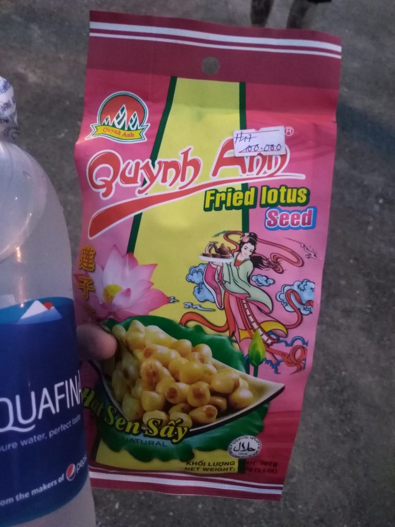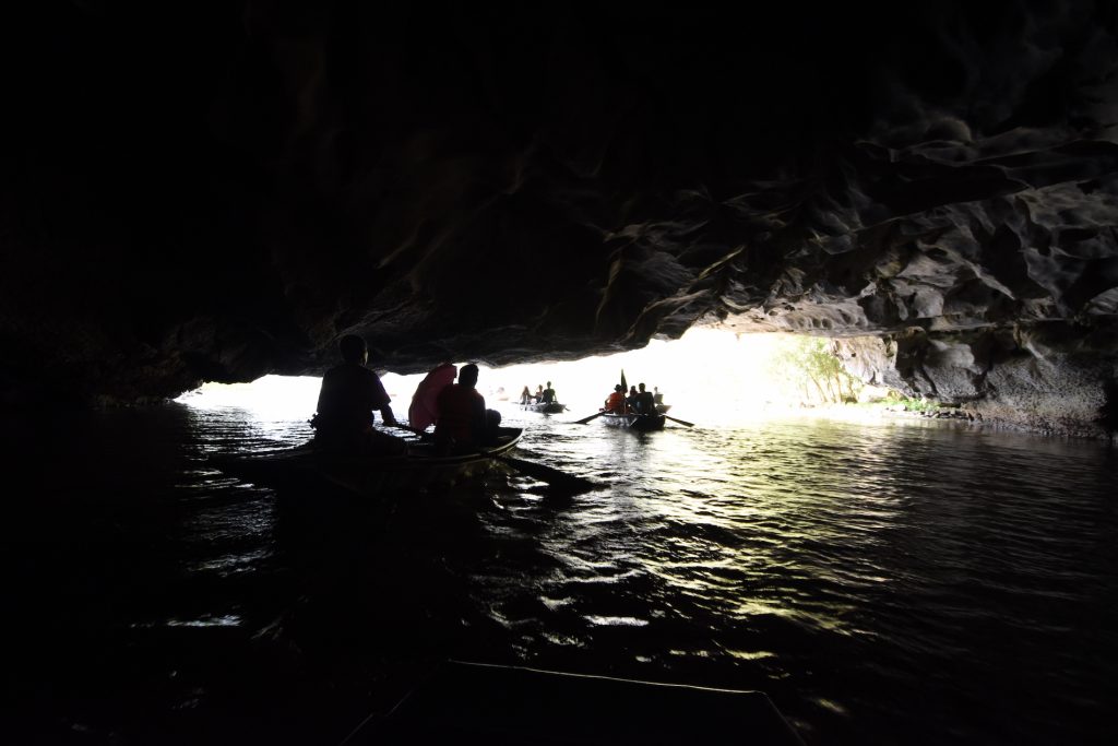Nach einem hektischen Mittagessen mit Buffet im Stile der Massenabfertigung kommen wir quasi zum Highlight der Tour. Die fahrt durch die Kalkfelsen. Das ganze findet auf kleinen Blechbooten statt. Immer 2 Leute plus ein Ruderer. Gerudert wird mit den Beinen. Fast 1.5 Stunden fahren wir durch die Landschaft. Links und rechts immer wieder Reisfelder in denen sich weiße Vögel (Reiher?) tummeln. Zwischendurch auch mal ein paar Schweine. Fotos schießen sich hier quasi von selbst. Die Felsen erstrecken sich mächtig über den Reisfeldern. Flüsse, die durch eine Felsenlandschaft fließen? Könnte fast einer Fjordlandschaft in Norwegen ähneln. Der gesamte Ort scheint nur dem Tourismus gewidmet zu sein. Auf dem Fluss tummeln sich haufenweise Boote auf denen zu 2/3 immer westlich aussehenden Menschen sitzen. Auf der Hälfte der Tour dürfen die Leute sich vom Boot aus ein paar Snacks kaufen immer mit der Bitte auch für den Bootskapitän etwas zu kaufen. Augenrollend kaufen die meisten etwas. Inzwischen steht die Sonne hoch und der Nacken wird rot.