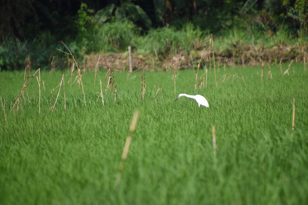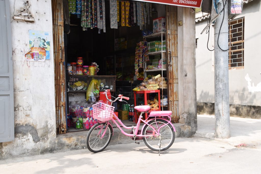 Als wir wieder an Land sind folgt nach einer kurzen Pause das letzte Ereignis. Fahrradfahren. Alleine. Ohne Tourguide. Wir wussten gar nicht, dass wir das mitgebucht haben. Wir bekommen jeder ein klappriges Fahrrad, mit halbwegs funktionierenden Bremsen. Etwa 20 Minuten fahren wir geradeaus bis wir zu einem kleinen Tempel kommen. Hier ist es wieder sehr touristisch. Zwischendurch wieder der schöne Blick auf die Felsen und die Reisfelder. Für den Tempel muss man etwas höher laufen. Dazu bin ich zu faul und so langsam dröhnt der Kopf. Ich sehe mich lieber um und erkunde eine Mini Banananplantage.