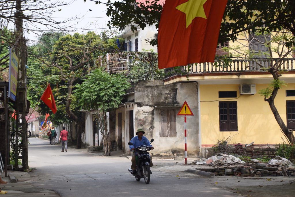 Also Ninh Binh heute. Wir starten kurz nach 8 Uhr mit einem kleinen Bus, nach 2 Stunden fahrt machen wir an einer Tankstelle Pause. Inzwischen sind wir quasi umzingelt von Reisfeldern. Das erste was ich nach dem Aussteigen mache ist nicht die Toilette zu besuchen sondern erstmal Fotos schießen. Ein Einheimischer kommt mit seinem Moped an mir vorbei und will, dass ich ein Foto von ihm mache. Gerne! Nach einer weiteren halben Stunde fahrt erreichen wir unsere erste Station. Die ehemalige Hauptstadt von Vietnam und ein Tempel, der zu Ehren eines Kaisers gebaut wurde. Das Klima ist hier deutlich feuchter, die Sonne guckt auch langsam hinter den Wolken hervor. Der erste kleine Sonnenbrand kündigt sich an. Der Tempel ist ganz hübsch. Wir laufen ein wenig herum, aber es gibt nur wenig spektakuläres zu sehen.