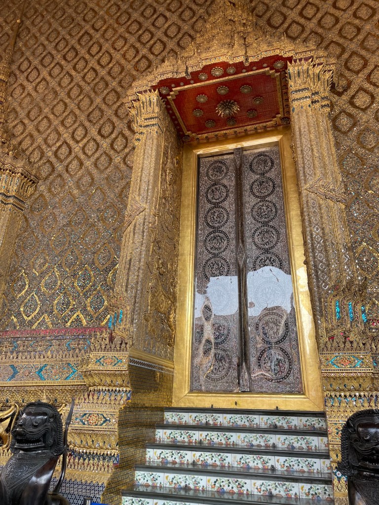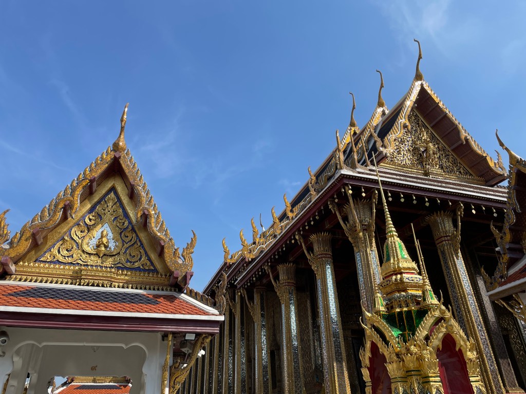 Der erste richtige Tag in Thailand. Wir sind abends gegen 21h schlafen gegangen und waren ca. 23 Uhr wieder wach. Gegen halb 2 schaffen wir es wieder einzuschlafen. Als ich wieder aufwache ist es schon hell und staune nicht schlecht als ich auf die Uhr schaue: 11:35 Uhr. Ok das war ne Menge Schlaf. War wohl dringend nötig. Aufgestanden gehen wir erst einmal „Frühstücken„. Natürlich eine Nudelsuppe. Anschließend machen wir uns auf den Weg zum Königspalast. Hier waren wir noch nie. Das ist der erste Tempel, in dem wir wirklich dazu verpflichtet werden Kleidung zu tragen, die die Beine und die Schultern bedeckt. Wie viele andere müssen wir erstmal in den Shop gehen und uns eine Hose und ein Shirt und auch eine Maske kaufen. Erstmal 800 Bhat weg. Dann der Eintritt: wieder 500 Bhat pro Person. und dann geht es in den wuseligen Tempel. Die kleinen Geschwister dieses Tempels, Wat Pho und Wat Arun, die wir aus vorherigen Reisen kennen, haben uns etwas besser gefallen. Hier sind viele Menschen, es sind viele Gebäude in die wir hinein gehen und jedes mal die Schuhe ausziehen müssten.