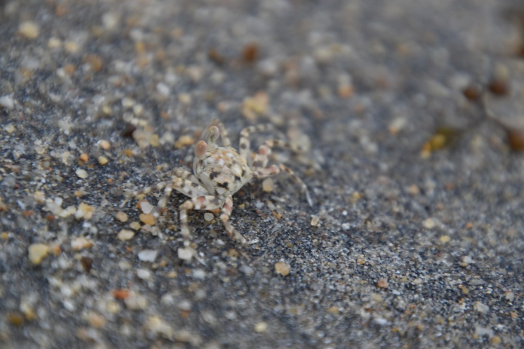 Inzwischen habe ich auch mal ein paar Geckos gesehen. Das sind immer sehr gern gesehene Tiere, weil sie auch gerne Mücken futtern. Von einer der großen Spinnen habe ich auch ein Foto mit meiner Kamera gemacht. Ich erspare euch das Foto. Je öfter ich da lang gehe, desto mehr, etwas kleinere, Exemplare entdecke ich. Als ich den Strand erkundet habe, habe ich auch ein paar Krabben gesehen. Man sieht dann immer ein Stück Sand schnell wegrennen. Und wenn man sich gut anstellt, dann bekommt man auch ein paar Fotos hin. Kurz nachdem ich das Foto aufgenommen habe, kam neben mir ein Hund angerannt und hat mich erschreckt. Da er aber von jemandem zurückgerufen wurde, zähle ich das nicht als Wildtier. Nur als Nahtoderfahrung, weil ich mich tierisch (haha) erschreckt habe.