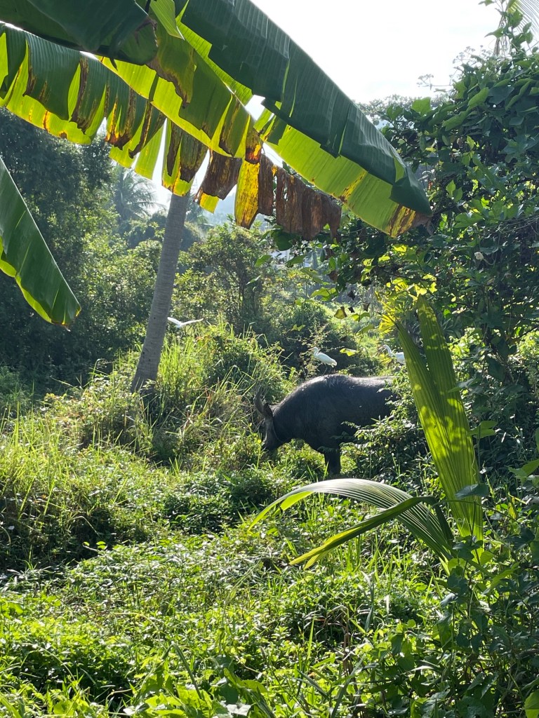 Inzwischen haben wir mit einem Eichhörnchen bekanntschaft gemacht, das in einem Nachbarbaum zu leben scheint und immer wieder durch die tropischen Bäume hüpft. Auf dem Feld hinter unserem Resort spaziert auch wieder häufiger ein Büffel herum, der auch immer von ein paar Reihern umgeben ist. Ich habe auch ein hübsches, blaues Insekt gesehen. Aber Insekten mögen es oft nicht so gerne, wenn man sie fotografiert.