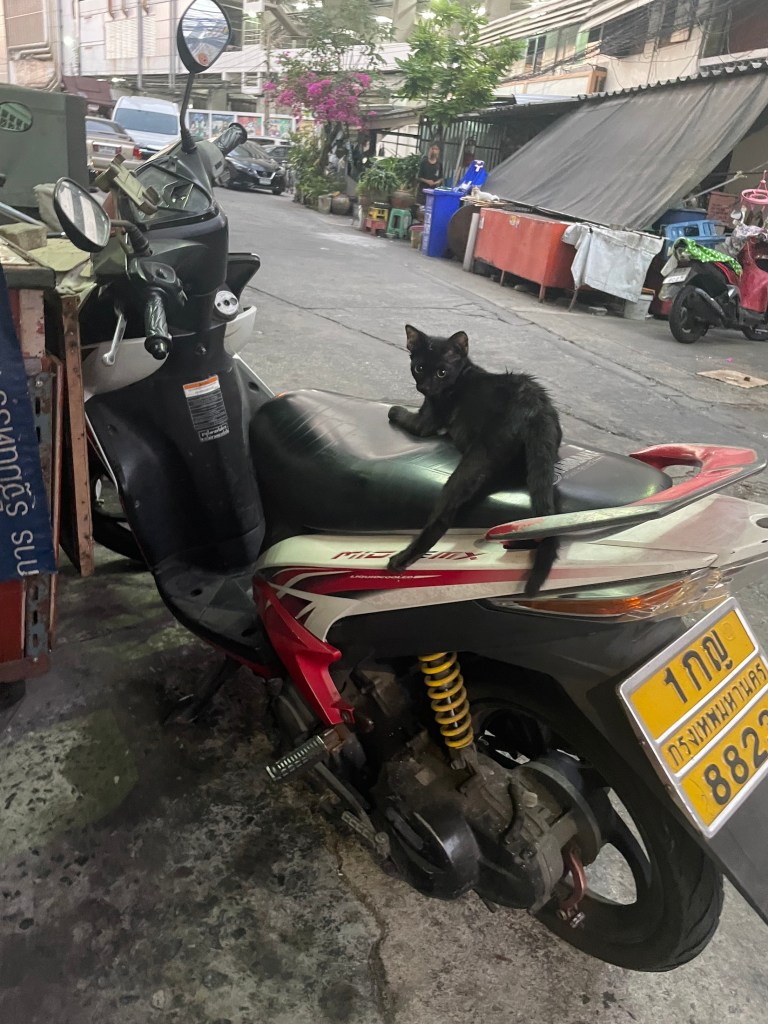 Während wir auf das Essen gewartet haben sind wir kurz nach draußen. Der Tempel (Wat) ist sofort zu sehen und lauter kleine Katzen, die gerade auch zu Abend gegessen haben. Das ist so eine richtige, Bangkoker Abendstimmung. Ein bisschen was von allem und es geht seinen Gang. Nach dem Essen gehe ich noch ein paar Fotos machen. Es gibt zwar nicht allzu viel hier, aber ein bisschen Abendatmosphäre bekomme ich aufgenommen. Man sieht viele rote Lampions herumhängen, es deutet alles auf das chinesische Neujahr hin.