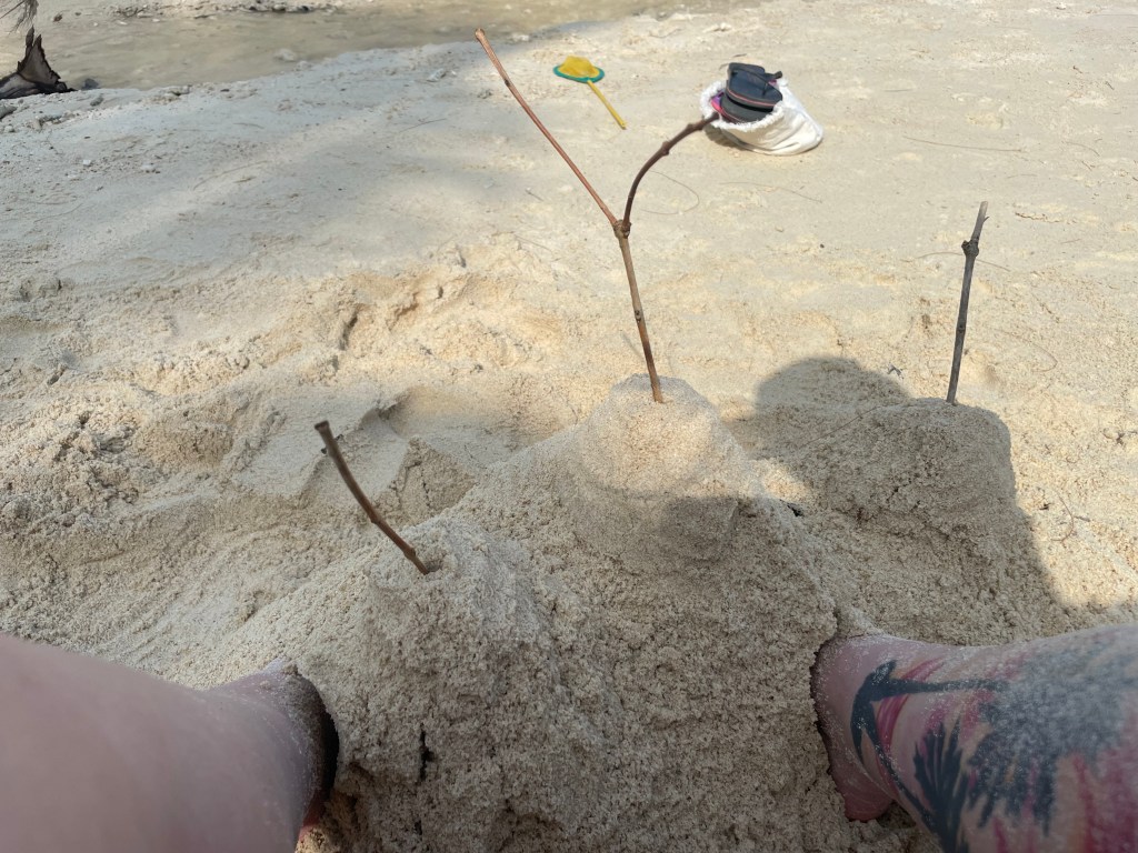 Der Sand ist schön weich und die Sonne zieht langsam herum. Heute wird’s schön. Ein bisschen windig und wellig ist es aber immernoch.