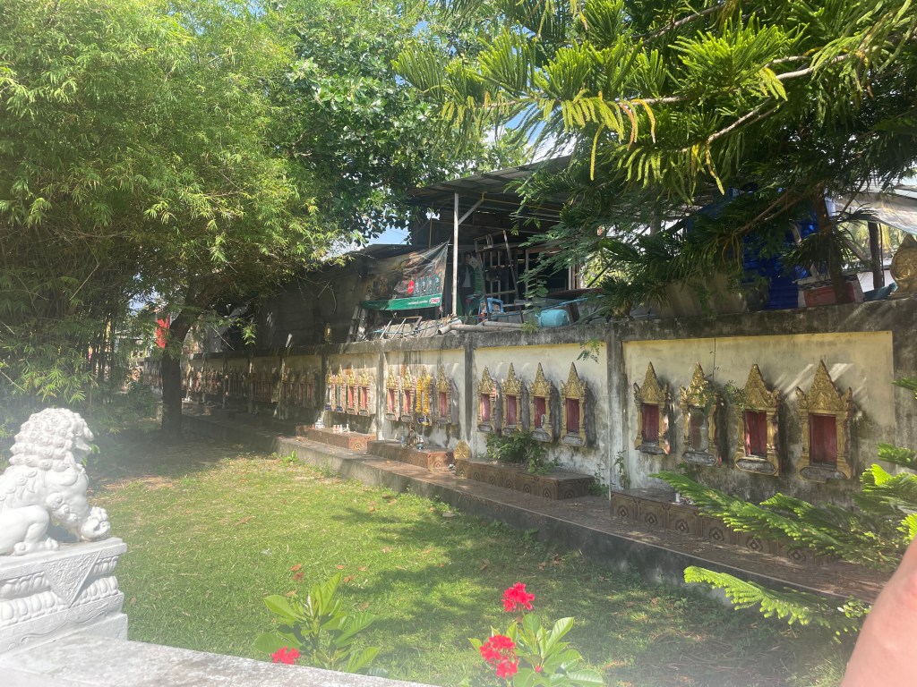 Wir stehen auf, gehen frühstücken, die Sonne scheint. Wir haben Lust auf einen kleinen Ausflug. Also rauf aufs Moped und ab in Richtung Süden. Wir wollen zu einem Wasserfall. Als wir kurz anhalten um auf die Karte zu gucken, ist gleich neben uns ein Tempel. Davon hatten wir noch nicht so viel dieses Jahr. Natürlich sind wir nicht gerade passend gekleidet, aber es ist ja auch keiner da. Wir laufen nur kurz herum, es ist auch verschlossen. An der Mauer hängen Gedenktafeln von verstorbenen.