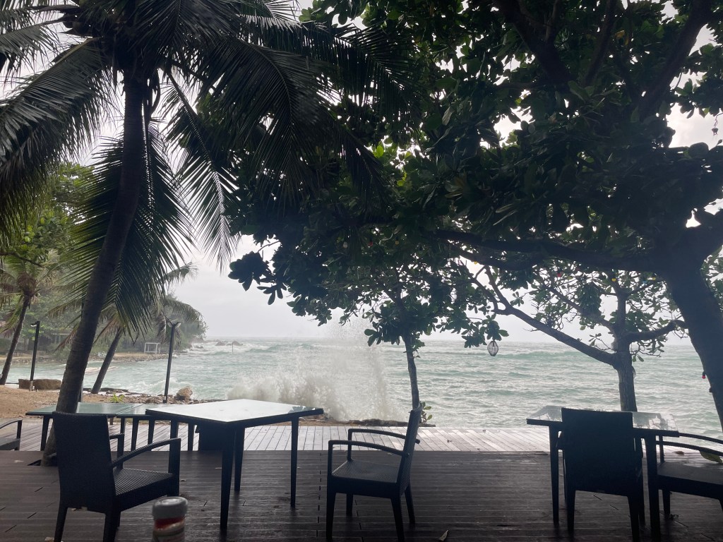 Der Sturm ist da. Morgens beim Frühstück krachen die Wellen schon gegen die Brandung. Jeder Tourist, der vorbei kommt muss das erstmal auf seinem Handy festhalten. Die eine Mitarbeiterin aus dem Restaurant meint, dass das jetzt nicht so üblich für diese Jahreszeit ist.