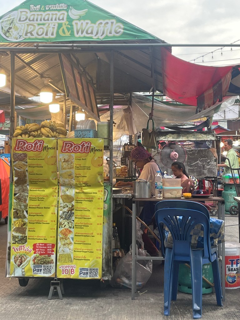 Es dauert doch immer recht lange, aber auf der Hinfahrt schlagen wir den richtigen Weg ein. Zunächst laufen wir über den Panthip Food Markt. Ich glaube, der ist jeden Tag. Hier gibt es ganz klassiche Thai Essensstände mit gebratenen, gebackenen oder gekochten sachen. Ich hole mir erstmal nur einen Mangoshake. Eine kleine Waffel als Snack nehmen wir auch mit.