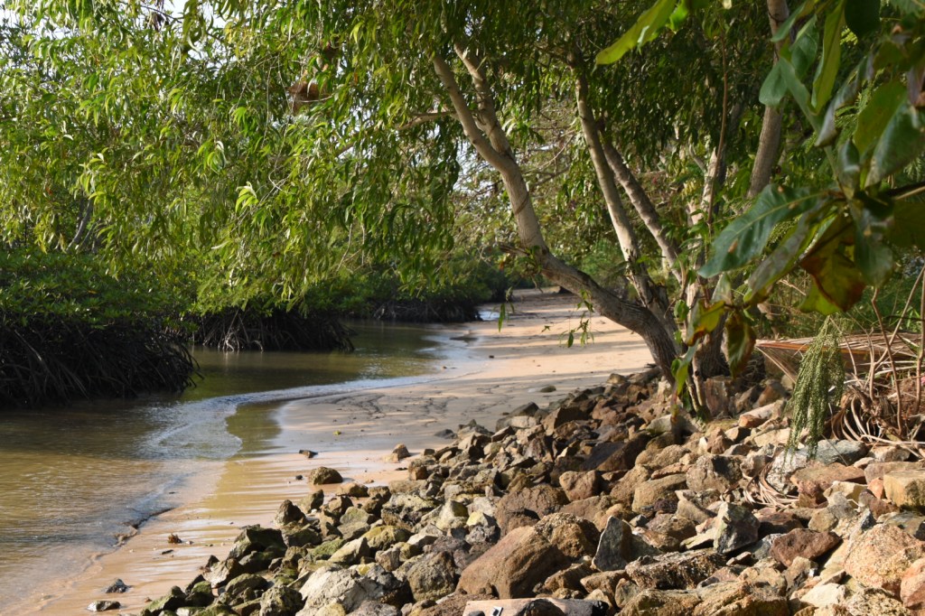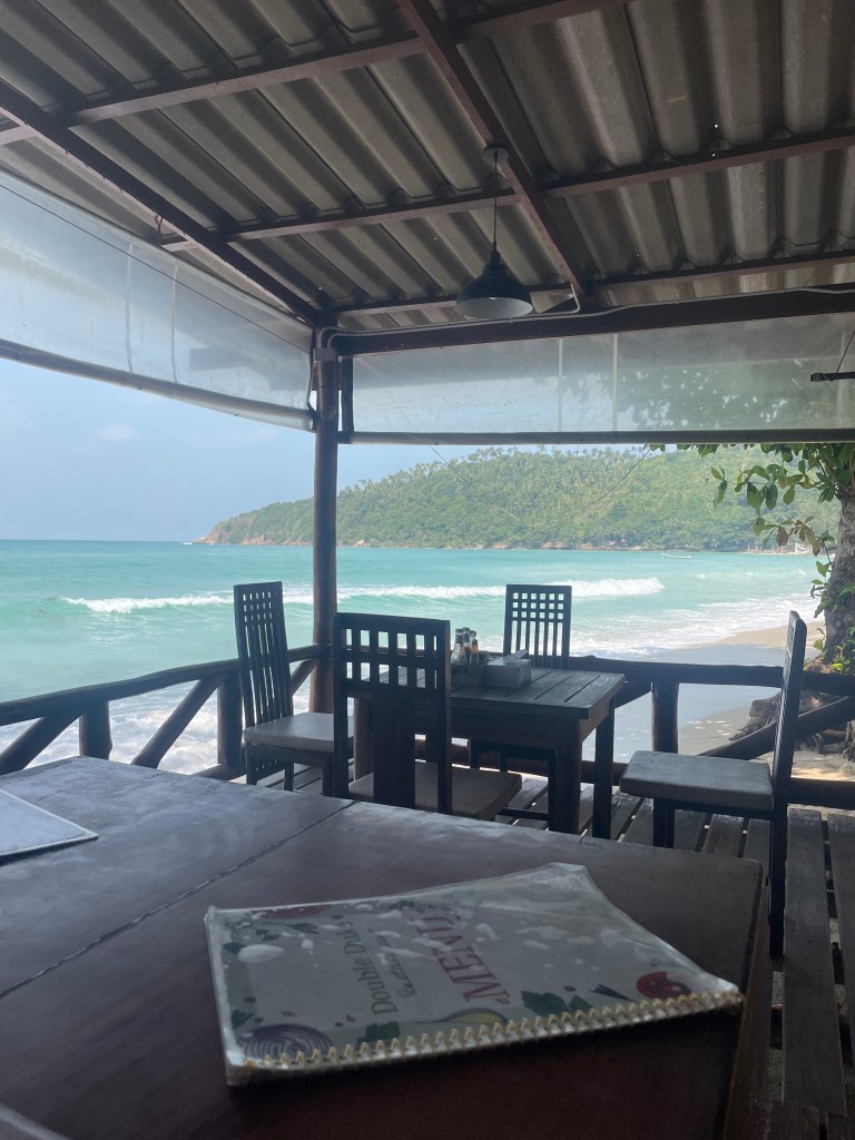 2 Stunden später ist das Wasser so weit zurück, dass wir zum Strand gehen können und zum ersten Restaurant gehen um etwas zu essen. Es ist schon wieder viel begehbarer hier und einige Leute gehen im Meer schwimmen.