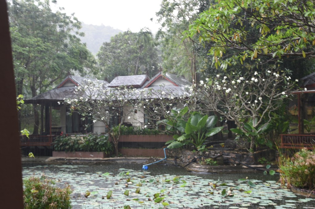 Danach wirds aber echt Zeit etwas zu essen. Und eigentlich auch für den Pool, aber man soll nicht mit leerem Magen in den Pool. Wir fahren zu einer Kreuzung und sehen ein Restaurant, wollen uns hinsetzen, aber die Köchin muss ins Krankenhaus. Ginge erst später mit dem Essen. Wir fahren etwas weiter und sehen ein Tolles Restaurant, da stehen auch ein paar Leute herum. Ausgestiegen, hingehen. Erst ab 14 Uhr. Ey! Ok letzte Chancen, sonst gehen wir eben bei uns am Strand essen. Aber wir finden dann eins, das auch gemütlich ist und sogar Hängematten hat und ein kostenloses Wasser wird uns auch gleich angeboten. Mir fällt dabei auf, dass es in Thailand eigentlich üblich ist, dass auf dem Tisch eine Kanne mit kostenlosem Wasser steht. Ist hier in der Region nicht so üblich.
