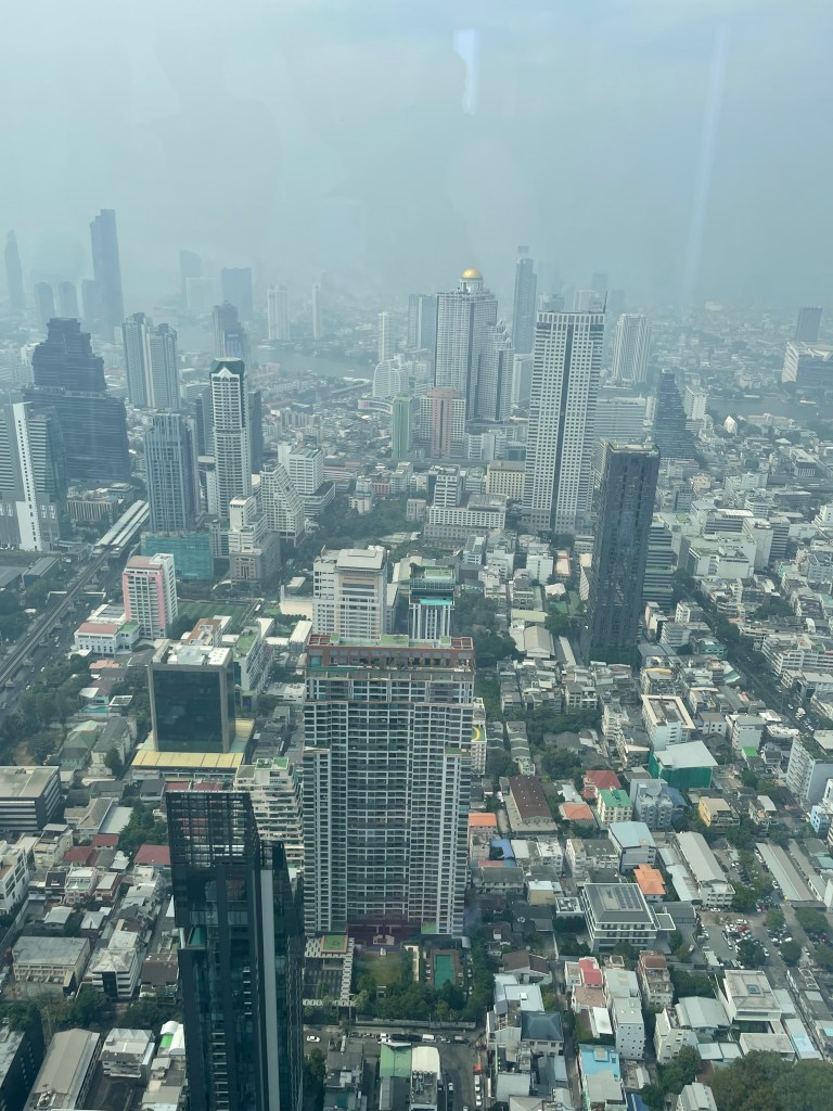 Morgens wachen wir auf ohne dass Vogelgezwitscher daran beteiligt ist. Es ist ruhig und das Bett im Shangri La ist unbestreitbar sehr bequem gewesen. Erstmal raus auf den Balkon. Bah, was für ein Dunst. Die Luftqualität in Bangkok ist mal wieder grauenhaft. Man sieht auch viele Menschen mit Maske herumlaufen.