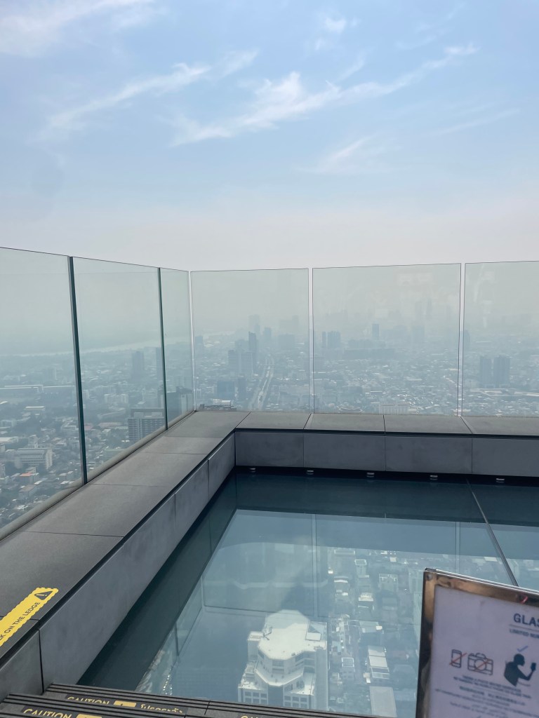 Dann geht es nochmal 4 Stockwerke höher. Hier gibt es das Skydeck inklusive einer Glasbodenplattform. Man muss sich Überzieher über die Schuhe ziehen, vermutlich um nix zu zerkratzen. Man darf auf dem Glasboden auch keine Fotos machen. Warum das denn?! Ich lasse mein Handy in der Tasche, aber niemand merk, dass ich meine Gopro dabei habe. Zumindest anfangs merken sie es nicht. Irgendwann meckern sie dann doch. Aber ist mir egal, hab dann genug gesehen. Verstehe den Sinn dahinter nicht. Es gab auch keinen Fotografen, der einen zu Fotos nötigt, die man am Ende teuer kaufen soll oder so. Denn so kennen wir es aus Kuala Lumpur. Doch selbst dort durfte man selber Fotos machen. Ich fands besser dort.