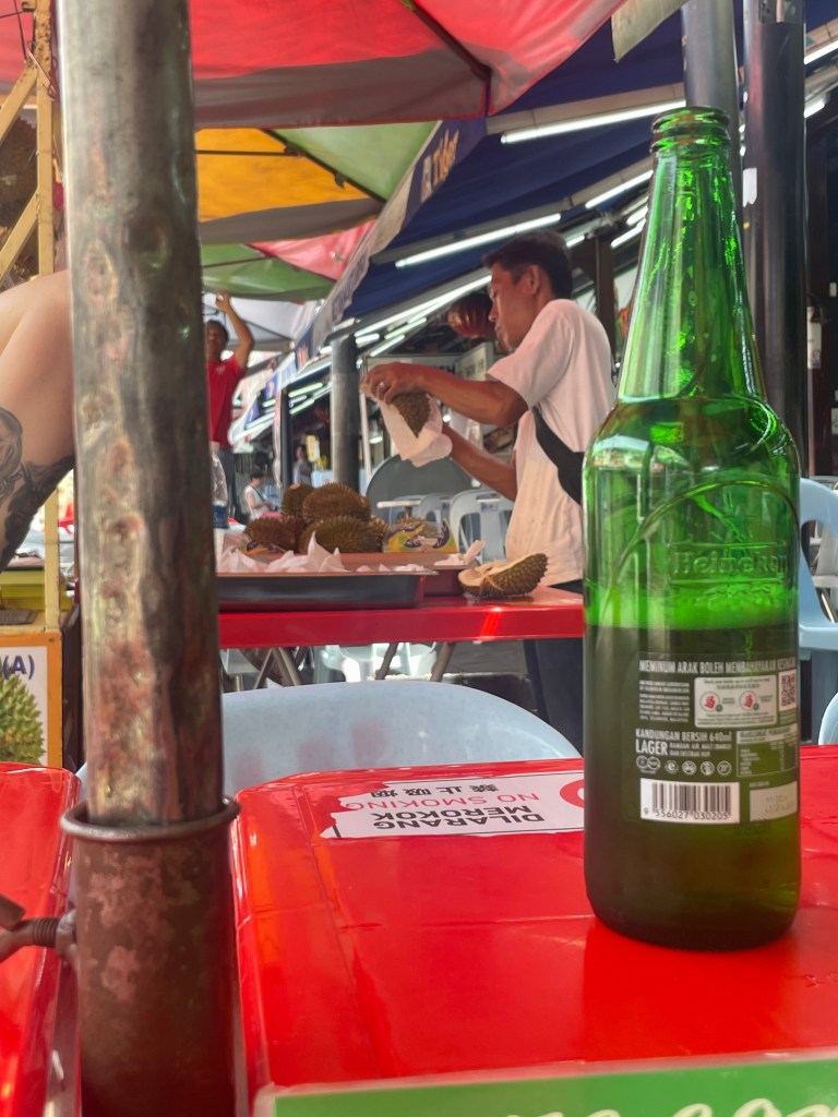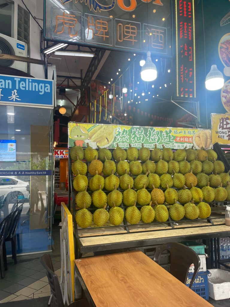 Später fahren wir 2 Stationen mit der Monorail nach Bukit Bintang. Ein Bezirk, der sehr viel belebter ist als die Hochhausregion bei uns. Direkt beim Aussteigen ist es wuseliger. Mehr Menschen, mehr Geräusche, viele Läden. Wir müssen nicht weit laufen und haben die Qual der Wahl was die Restaurantauswahl betrifft. Es ist, wie oft hier, sehr chinesisch geprägt. Mit original chinesischen Restaurants habe ich in Asien aber schon so meine Erfahrung. Das ist oft wirklich sehr exotisch. Naja wir entscheiden uns für ein Thailändisches Restaurant. Muss ja auch mal sein. Und auch oft hier gibt es Durianfrüchte zu kaufen. Hat die irgendwie Saison oder stehen die Malaysischen Bewohner besonders auf die Frucht?