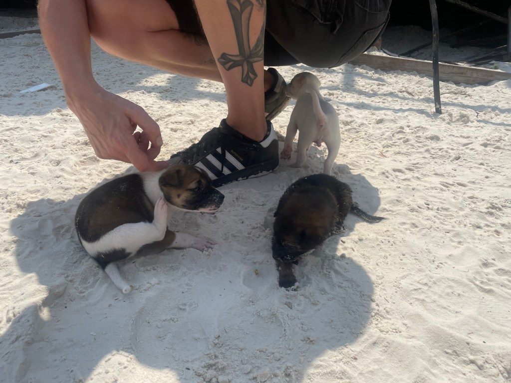 Zurück in der Zivilisation gehen wir uns etwas erfrischen in einem Restaurant. Direkt gegenüber ist ein Stück Strand und dort tummeln sich einige, nur wenige Tag alte, Welpen.
