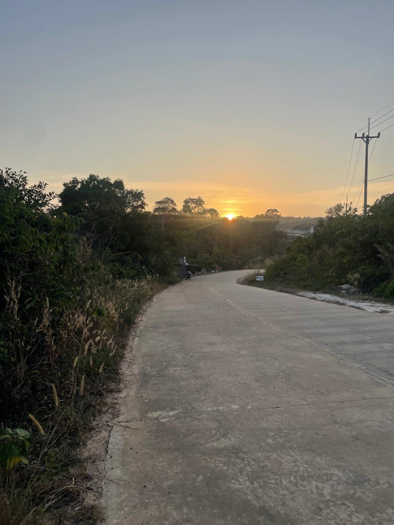 Am frühen Abend sind wir dann nochmal in Koh Touch, weil wir dort ein Restaurant gefunden haben, das uns gefällt. Am Ende laufe ich einen Teil der Strecke zurück. Eigentlich wollte ich in einen Souvenirladen, den ich schon mehrfach am Sandpistenrand gesehen habe. Aber als ich gerade reingehen will, sehe ich, dass geschlossen ist. Dann nutze ich eben die schöne Tageszeit um ein paar Fotos auf dem Weg zu machen. Ab und zu fährt mal jemand an mir vorbei. Die Kambodschaner winken auch manchmal. Zu Fuß geht man hier eher selten längere Strecken.